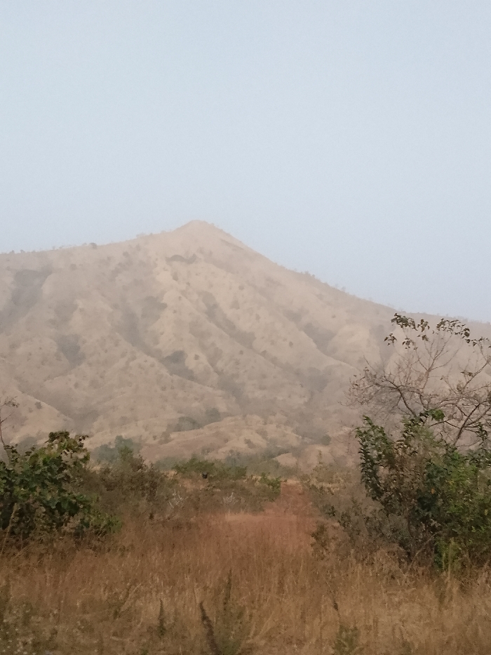 The image displays a hazy, arid landscape in Gu, Nigeria, devoid of human presence or activity. A large, dry hill or mountain, characterized by undulating slopes covered in sparse, light brown vegetation, occupies the mid-ground, with its rounded peak positioned slightly right of center. The sky, filling the upper third of the frame, is a light blue-grey, obscured by atmospheric haze. The foreground consists of dry, reddish-brown and golden grasses, interspersed with low-lying shrubs. On the left and right edges of the foreground, small clusters of green-leafed bushes and some bare-branched vegetation are visible. Patches of reddish-brown earth are discernible amongst the dry vegetation in the lower mid-ground.