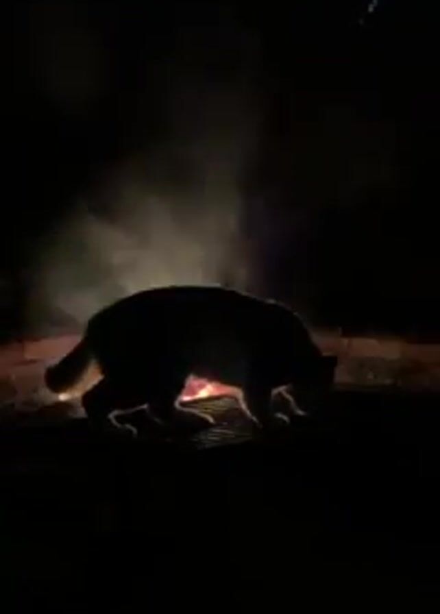At night, a dark-furred, medium-sized animal, possibly a dog, walks on a metal grate over glowing embers of a small fire. There is smoke coming from the fire. The rest of the scene is very dark, with only some trees barely visible in the background.
