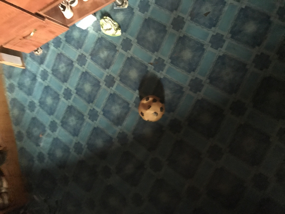 An indoor scene in Oba-Ile, Nigeria, depicts a floor partially covered by blue and teal patterned linoleum or tiles. A distinct shadow line diagonally bisects the floor from upper-left to lower-right, creating a darker foreground and a brighter background. A small, light brown, spherical object with dark spots, resembling a worn ball or cookie, rests on the shadowed portion of the floor, casting a shadow to its lower-left. In the upper-right quadrant, a multi-tiered, light brown wooden cabinet or shelving unit is visible. On one of its shelves, two white shoes are present. Below the shoes, on the floor, a crumpled light green fabric object is situated. Part of a dark metal furniture leg or stand is also visible in the lower-right. No individuals are present.