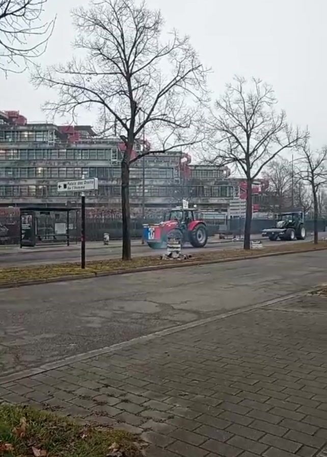 row of tractors driving down a road on an overcast day. The tractors are a mix of red and green, with large wheels. One of the red tractors is stopped on the side of the road, emitting gray smoke into the air. A pedestrian walkway is visible on the side of the road, made of gray bricks. Bare trees are planted along the road. In the background is a large, red and gray building, partially obscured by the trees. A street sign is visible in front of the building. In the audio, a horn blares.