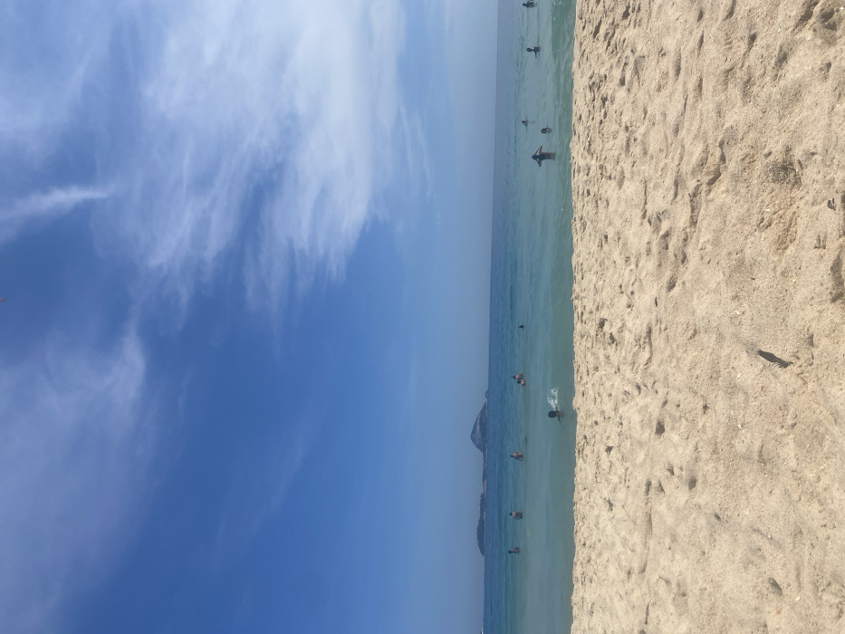 A beach scene, rotated 90 degrees, displays a bright blue sky with wispy clouds dominating the left side. The ocean occupies the center, dotted with figures swimming. A sandy beach covers the right side, showing varying textures and a dark shadow near the bottom edge.