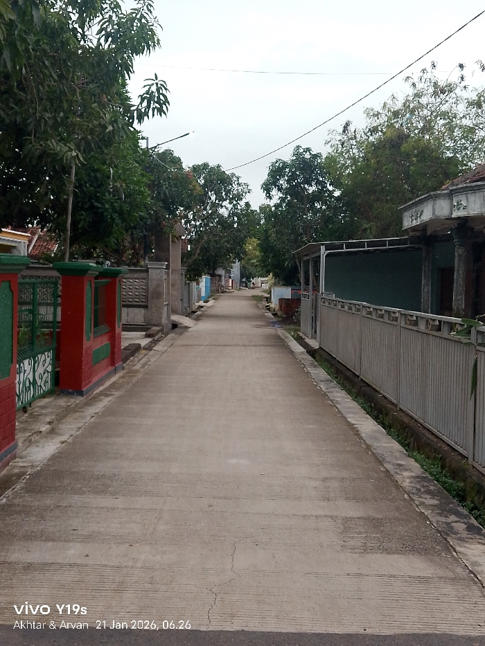 A straight concrete road stretches between houses and fences, disappearing into the distance. Trees line the sides of the road, their branches reaching toward a cloudy sky. A red and green fence stands on the left, while a longer, gray fence runs along the right. The road shows signs of wear with cracks and lines. A small drainage ditch runs beside the gray fence. The bottom of the image contains a watermark.