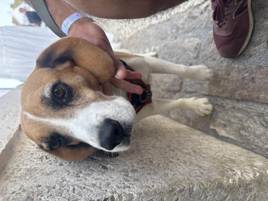 - "The image displays a tricolor Beagle dog, predominantly white with tan and black markings, captured in a head-on, eye-level perspective in Saint-Tropez, France" by FM-CIOZn2, licensed under CC BY 4.0