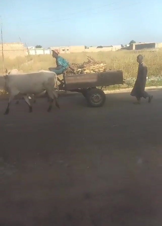 street scene on a sunny day with two white oxen pulling a cart loaded with what appears to be firewood. A person wearing a blue shirt and a red cap is sitting on top of the firewood in the cart. Walking alongside the cart is another person dressed in a dark, long-sleeved garment. The street is paved, but appears old and a little worn. On either side of the street is sparse vegetation. Buildings, some with walls around them, can be seen in the background.