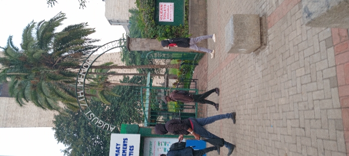 The image presents an outdoor urban scene at the entrance to the August 7th Memorial Park in Nairobi, Kenya