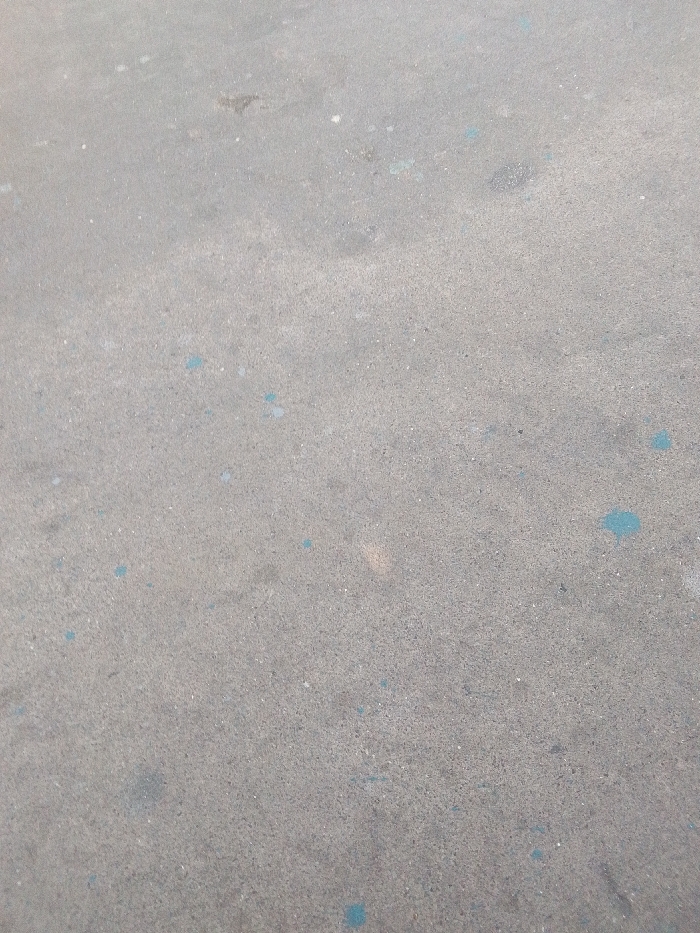 coarse, gray concrete surface. The texture is subtly uneven with small specks and variations in tone. Randomly scattered throughout are small, irregular spots of light blue paint. Some minor discoloration and staining are also present, adding to the weathered appearance of the concrete. The overall impression is that of a well-worn and slightly stained surface.