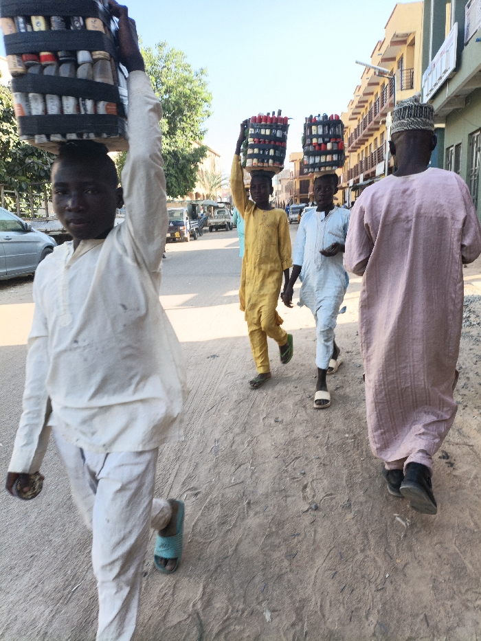The image displays an outdoor street scene in Fagge A, Nigeria, during daylight hours. Four males are walking from left to right across an unpaved, dusty path. In the foreground, a young male wearing a white long-sleeved tunic and trousers faces the camera, balancing a multi-tiered black tray filled with small, various-capped bottles on his head, supported by his raised right arm. He wears a single light blue slide on his left foot and holds a small, circular object in his left hand. Directly behind him, another young male, dressed in a yellow long-sleeved tunic and trousers, walks away from the camera, also balancing a similar multi-tiered tray of bottles on his head, wearing green sandals. To his right, a third young male in a light blue long-sleeved tunic and trousers carries an identical tray of bottles on his head, walking away from the camera, wearing white slides. On the far right, an adult male, seen from behind, wears a light pink traditional garment and a patterned cap, walking away from the camera in dark shoes. The background features a paved road with parked and moving vehicles, including a silver sedan on the left. Multi-story buildings with balconies and a partial green facade line the street on the right. Green trees are visible on the left side of the background under a clear blue sky.