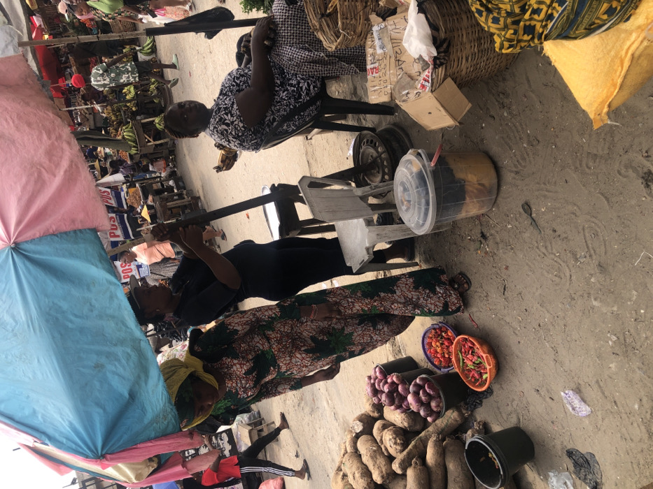 The image displays an outdoor market scene in Aiyetoto-Asogun, Nigeria, under bright daylight on unpaved, dusty ground