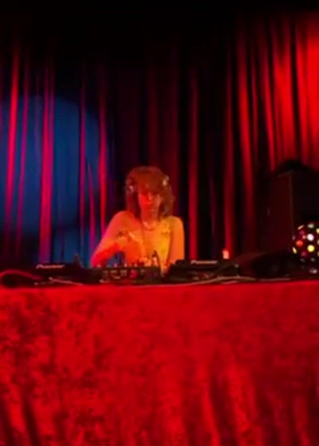 A DJ wearing headphones is playing music at a club. She is in the center of the frame behind a red-velvet-covered table with DJ equipment on it. Behind her is a stage curtain with red and blue lighting. In the background there is also a speaker and a disco ball. A few objects sit on the table in addition to the DJ equipment including a bottle, a candle, and a glass. A person is standing near the camera and is out of focus in the foreground.