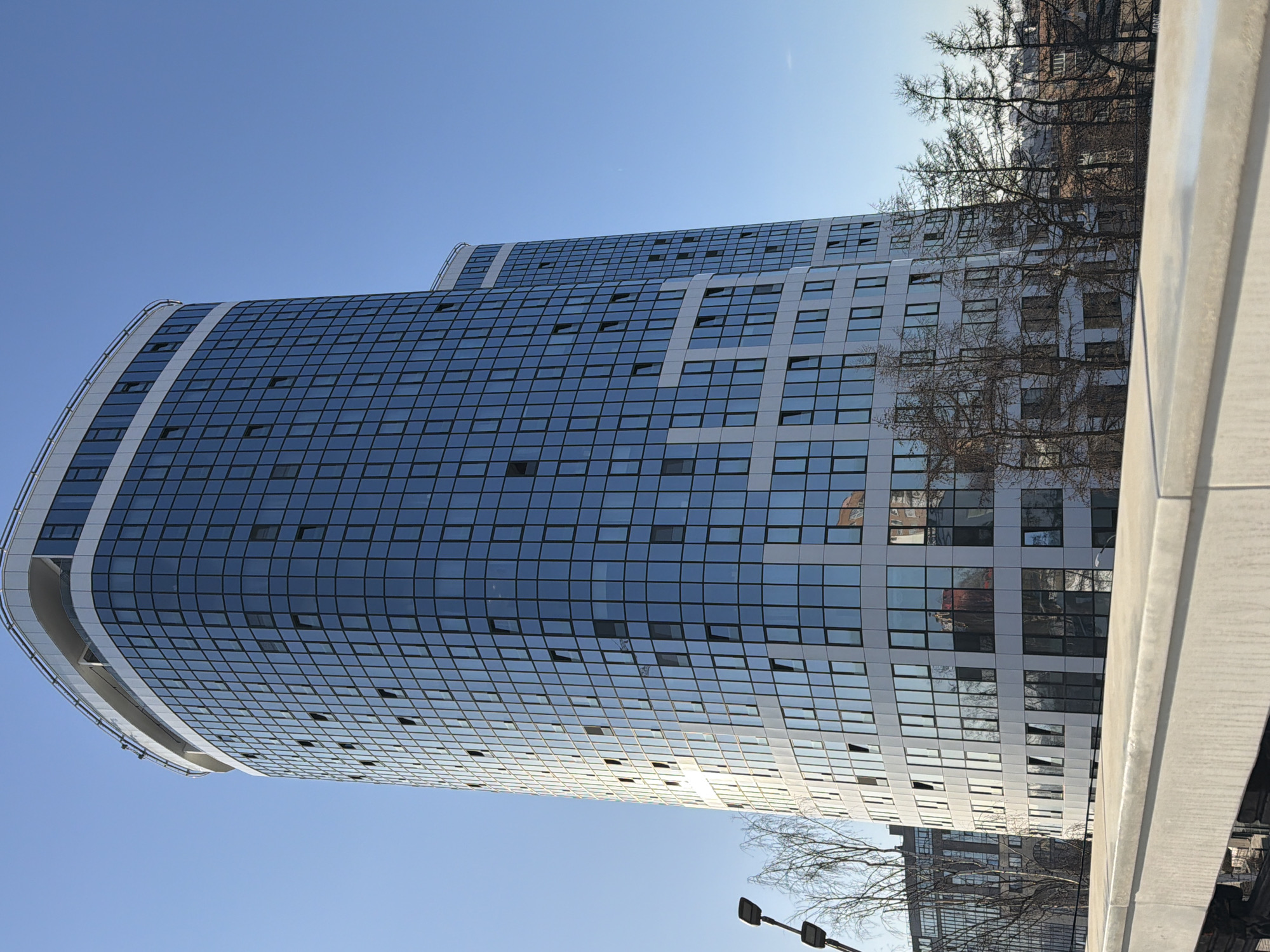 A vertical, low-angle, daytime shot depicts a modern, curved building, most likely in Izhevsk, Russia, given the building's architectural style and the surrounding environment. The building's facade is characterized by a grid of rectangular windows that reflect the sky and surrounding environment. Some windows are open. The sky is clear and blue. Bare tree branches are visible in the upper right and lower portion of the frame, partially obscuring the building. A light pole is at the bottom of the frame. A concrete structure, possibly a bridge or overpass, is partially visible on the right side of the image.