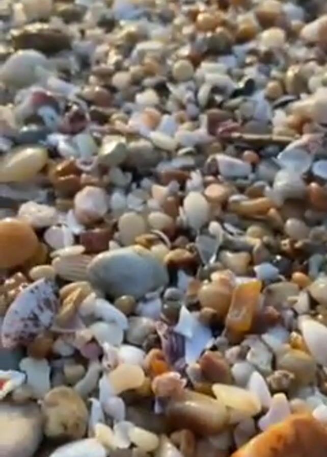 The video begins with a close-up view of a beach covered in small pebbles and seashells