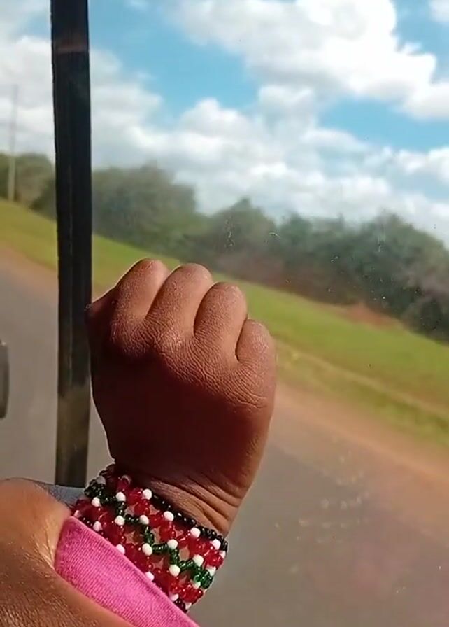 A woman's hand in a pink sweater holds a baby's hand with a beaded bracelet, resting against a bus window