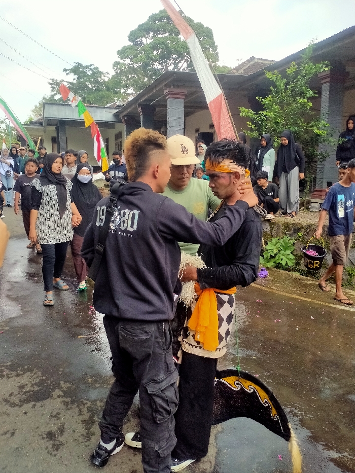 The image depicts a street scene in Kerjo, Indonesia, likely during a cultural event or procession. In the immediate foreground, three adult males are centrally positioned on a wet, asphalt road. The man on the left, facing right, wears a black hooded sweatshirt with "19 80" printed on the back and black cargo pants, his hair styled with bleached, spiky tips and shaved sides. He has his right hand on the left shoulder of the man in the center, who wears a light green t-shirt and a beige baseball cap with a dark logo (appearing to be "LA"). This central man faces left, looking towards the third man. The third man, on the right, wears a long-sleeved black shirt, black pants, and a checkered black and white sarong-like garment with an orange fabric draped over it. He has a yellow bandana wrapped around his head, and his face appears solemn or strained, with dark marks under his eyes, possibly makeup or smudges. He holds a bundle of white, stringy material in his hands. A dark, stylized object resembling a traditional horse's head or saddle, with yellow accents and a light-colored tail, rests on the ground next to his feet. Behind these three, a crowd of approximately 20-30 individuals, mostly adults and some children, observe from both sides of the road and a raised stone platform bordering a house on the right. Many in the crowd wear casual clothing, with several women sporting hijabs. On the left side of the road, a woman in a patterned top and dark pants walks forward, holding hands with a child partially visible behind her. Buildings with tiled roofs and stone pillars are visible in the background, along with green trees and foliage. Red and white striped banners, resembling Indonesian flags or decorative pennants, are strung vertically on poles, with other multicolored flags visible further down the street. The ground is visibly wet, indicating recent rain or a wet environment. On the right, a young male carries a black bucket with white text, "PGR," and scattered pink petals are visible on the wet ground. The sky is overcast.