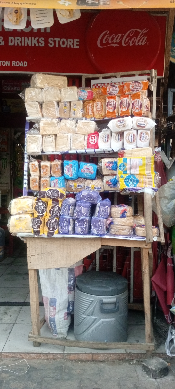 A roadside "Drinks Store" displays various brands of bread on a wooden stand. The top shelf features stacks of plain white bread, "City Fresh," and "7 Stars" bread. The middle shelf has more white bread, "GT," "Hotbite," "Homo," and "City Fresh." The bottom shelf shows "M Delight Bread," "White Light Special Bread," and round, flatbread. A Coca-Cola sign is visible above. A "Dangote Cement" bag and a grey cooler sit below the stand.