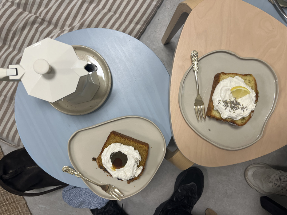 The image presents an overhead view of an indoor setting, likely a cafe or casual dining area, located in Kaiserslautern, Germany. The specific address or establishment within the city is not discernible from the visual information provided. The scene features two irregularly shaped, low tables. The upper table is light blue, displaying an irregularly shaped, light gray plate with a slice of yellowish-brown cake. This cake is topped with a generous portion of white whipped cream, centrally adorned with a pool of dark brown, glossy liquid, possibly caramel or syrup. A silver-colored fork with an ornate, floral-patterned handle rests on this plate. Adjacent to the plate, a white, octagonal Moka pot is positioned on a small, speckled beige ceramic saucer. Below and to the right, a second irregularly shaped table with a light pink or natural wood surface holds another identical light gray plate. This plate contains a slice of yellowish-brown cake topped with white whipped cream, garnished with dried lavender florets and a small lemon wedge. A second silver-colored fork, similar in design to the first, is placed on this plate. The surrounding environment includes a light gray floor. To the upper left, parts of a dark brown bag and a light blue knitted sock are visible. Towards the bottom left, a foot clad in a dark boot and another wearing a white sneaker are partially visible, indicating human presence in close proximity to the tables. To the right of the upper blue table, a striped fabric, featuring beige and light brown tones, is partially visible, suggesting upholstered seating or cushioning.
