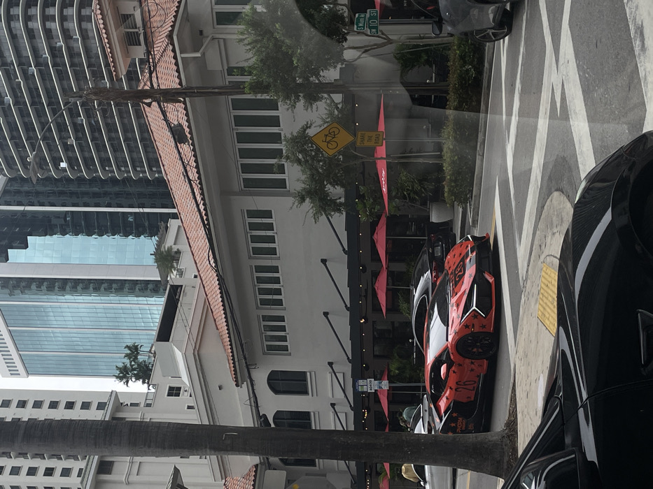 A street scene presents a mix of modern and classic architecture. Tall glass skyscrapers are visible in the background, contrasting with a white building with a red-tiled roof and numerous windows. Red umbrellas line the street, shading parked cars, including a vividly patterned sports car. A bicycle lane sign is visible. A tall palm tree and street lighting further define the urban setting.
