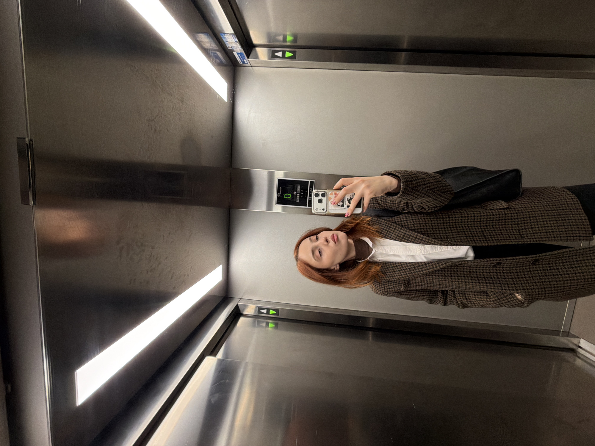The scene is an interior view of an elevator located in Strasbourg, France. The elevator car features brushed metallic, likely stainless steel, walls and a dark ceiling with two recessed rectangular LED light panels. A control panel on the reflected left wall (viewer's left) displays a digital "0" indicating the current floor, along with illuminated green upward-pointing arrows, and the text "enno" above the floor indicator. A female individual with shoulder-length reddish-brown hair is depicted taking a mirror selfie. She is wearing a brown and black houndstooth patterned long coat over a white collared shirt and a brown turtleneck. Black pants are partially visible. She holds a white smartphone, encased in a clear cover with small decorative stickers or images, in her right hand, positioned to capture her reflection. Her left hand is placed into her coat pocket. A black shoulder bag hangs from her left shoulder. Her gaze is directed slightly to her right, away from the phone, with a slight pout to her lips.