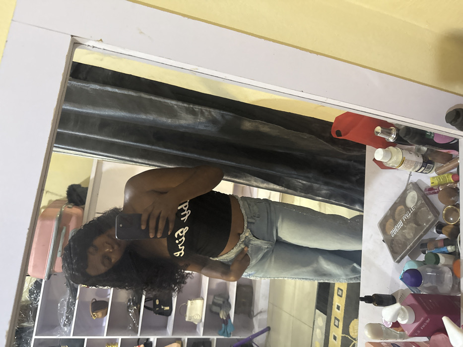 A woman with curly dark hair takes a mirror selfie, wearing a black crop top and light jeans. Behind her are shelves with various items, including bags and shoes. The mirror reflects part of a vanity surface cluttered with makeup and beauty products, with a red cap visible near the top. The room is illuminated with yellowish light. The mirror has a white frame.