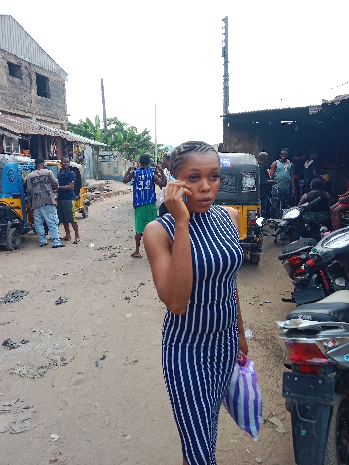 The scene is a street in Obosi, Nigeria. In the foreground, a young woman with braided hair wears a sleeveless, navy blue and white vertically striped dress. She holds a mobile phone to her right ear and carries a purple and white striped plastic bag in her left hand. The ground is an unpaved dirt road. In the midground, several individuals and vehicles are visible. To the left, a blue and yellow auto-rickshaw is parked, with two men standing near it. Behind them is a two-story building with exposed concrete blocks and a corrugated metal roof. Centrally, a man wearing a blue basketball jersey with "O'NEAL 32" printed on the back faces away. To the right, another yellow auto-rickshaw is parked alongside multiple motorcycles and scooters. Behind these vehicles, a dark structure with a corrugated metal roof is visible, with several people gathered around it. A tall cellular tower is prominent in the background on the right. The sky is overcast.