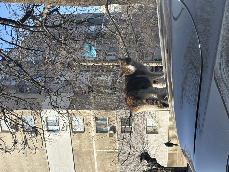 - "A calico cat, predominantly brown and white with darker tabby markings, stands on the dark-colored roof of a vehicle in the foreground, facing the viewer" by FM-HmsFR2, licensed under CC BY 4.0