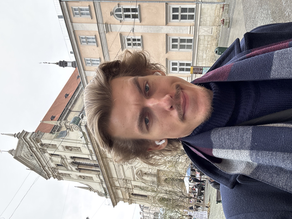 A male individual is depicted in a selfie, positioned outdoors in Soborna Square, Lviv, Ukraine, with the Bernardine Church and Monastery (Church of St