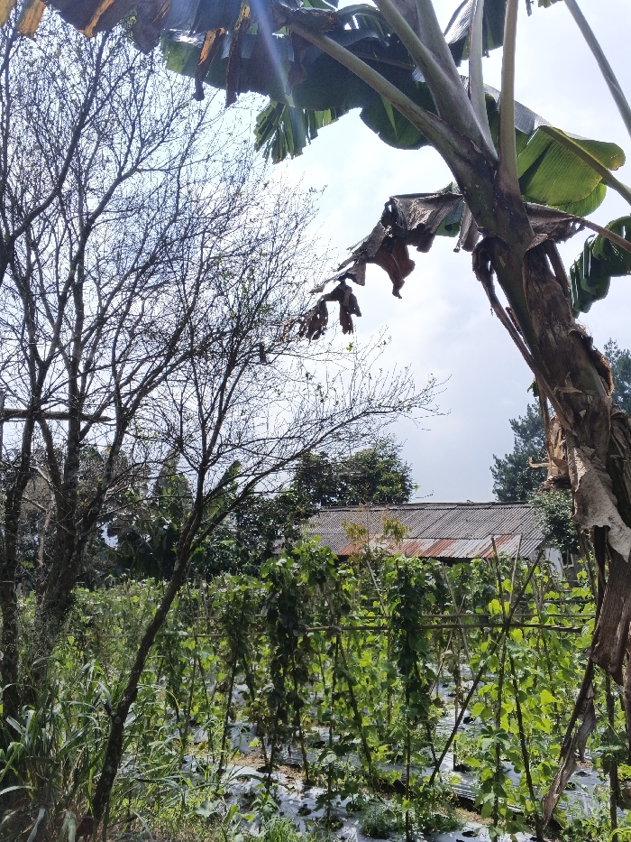 An outdoor scene in Ea Tê, Vietnam, depicts an agricultural area under a partly cloudy sky with visible sunlight. In the foreground, a banana tree trunk with green and decaying brown fronds occupies the right side of the frame, extending towards the upper right corner. To the left, several deciduous trees with mostly bare branches and sparse green leaves are visible against the sky. The midground features a cultivated field where rows of green climbing plants, likely a type of bean, are supported by a lattice-work of bamboo poles forming trellises. The ground beneath these plants is covered with white or silver plastic mulch sheeting, showing signs of use. Tall green grasses or stalks are visible in the lower-left foreground. In the background, a single-story residential or utility structure is partially visible. It has two distinct roof sections: the closer section features a heavily rusted, corrugated metal roof, while the section behind it has a gray, corrugated roof. Various green trees and foliage surround the structure and extend into the distant background. No individuals are present in the image.