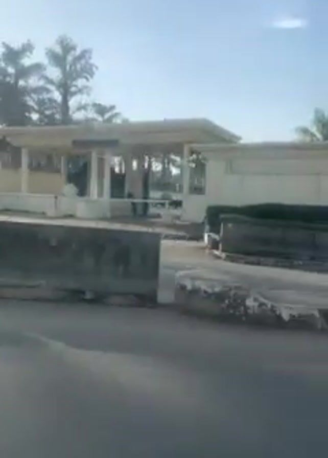 road with a white wall running along it. Behind the wall are trees and some buildings. There are also some palm trees. The camera is moving, presumably from a moving vehicle. The sky is blue and there is a bright sun. In the first frame, concrete barriers can be seen in the foreground blocking a gate. There are street lights visible along the road.