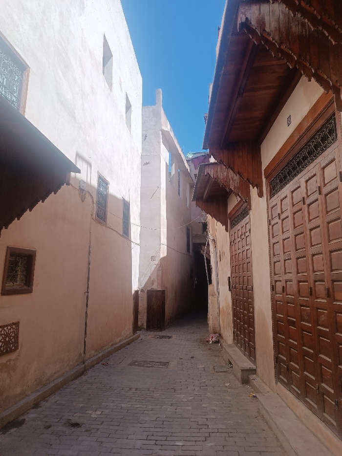 - "This image depicts a narrow cobblestone street, likely located within the medina of Meknes, Morocco, given the architectural style" by FM-oCAV73, licensed under CC BY 4.0