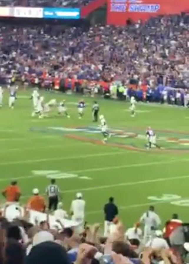 scene at a football stadium packed with spectators. The field is green and marked with lines. Football players wearing white uniforms are visible on the field along with referees in black and white striped shirts. Many spectators are wearing blue clothing, and several raise their arms in the air, cheering. A sign reading "THIS IS THE SWAMP" is visible in the background. The camera shakes and the focus shifts rapidly as the crowd moves, indicating excitement.