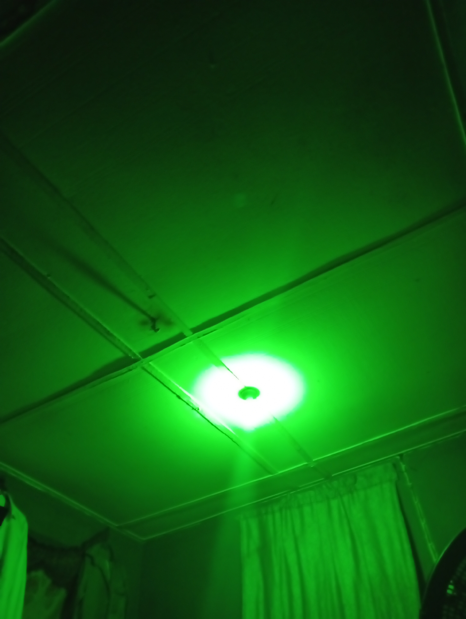 interior of a room illuminated by a bright green light source, likely a light fixture on the ceiling