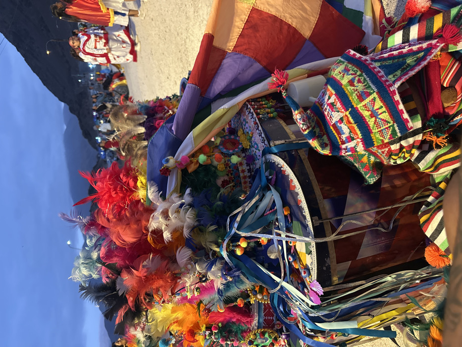 Vibrant, colorful feathers burst from a bundle, adorned with beads and ribbons. Adjacent, a geometric-patterned hat rests on a drum decorated with streamers and what appears to be a political symbol. A patchwork flag or cloth with various colors and squares sits atop the arrangement. In the background, figures in traditional clothing stand on what looks like a stage or street, set against a mountainous backdrop under a dusk sky.