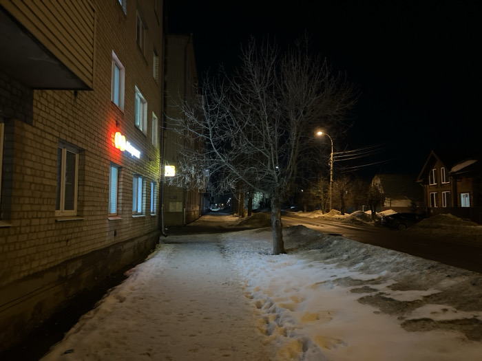 The image depicts a nighttime winter scene in Kladovitsy, Russia. On the left, a multi-story brick building with multiple rectangular windows is illuminated by a prominent red-orange neon sign and a smaller yellow sign. A snow-covered sidewalk with visible footprints runs parallel to the building. In the midground, a bare deciduous tree stands centrally, with its branches silhouetted against the dark sky. To the right of the tree, a street light on a pole emits a bright yellow glow, illuminating a snow-lined asphalt road. Further right, a dark wooden house with illuminated windows and a peaked roof is visible. Snow banks line the edges of the road and sidewalk. No people or active interactions are visible.