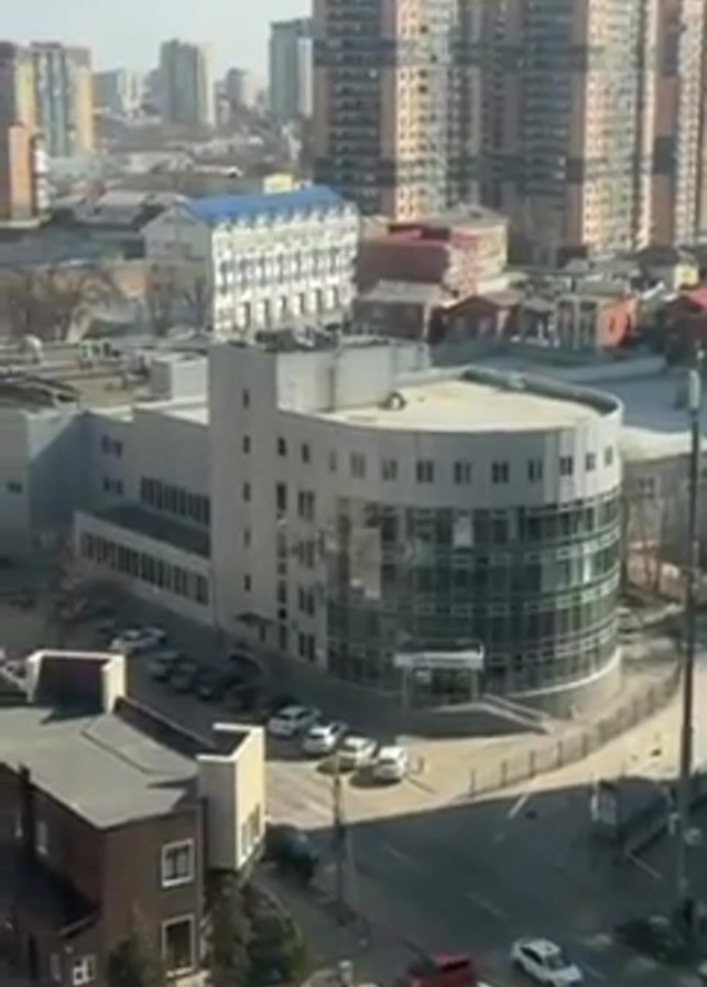 cityscape on a bright, sunny day. There are many buildings, including tall apartment buildings, and smaller commercial or residential structures. Cars are seen driving on the streets below. The camera pans slowly across the scene, revealing more of the urban environment. There are some trees visible, mostly bare, indicating it may be early spring. The sky is mostly clear, with a few scattered clouds.