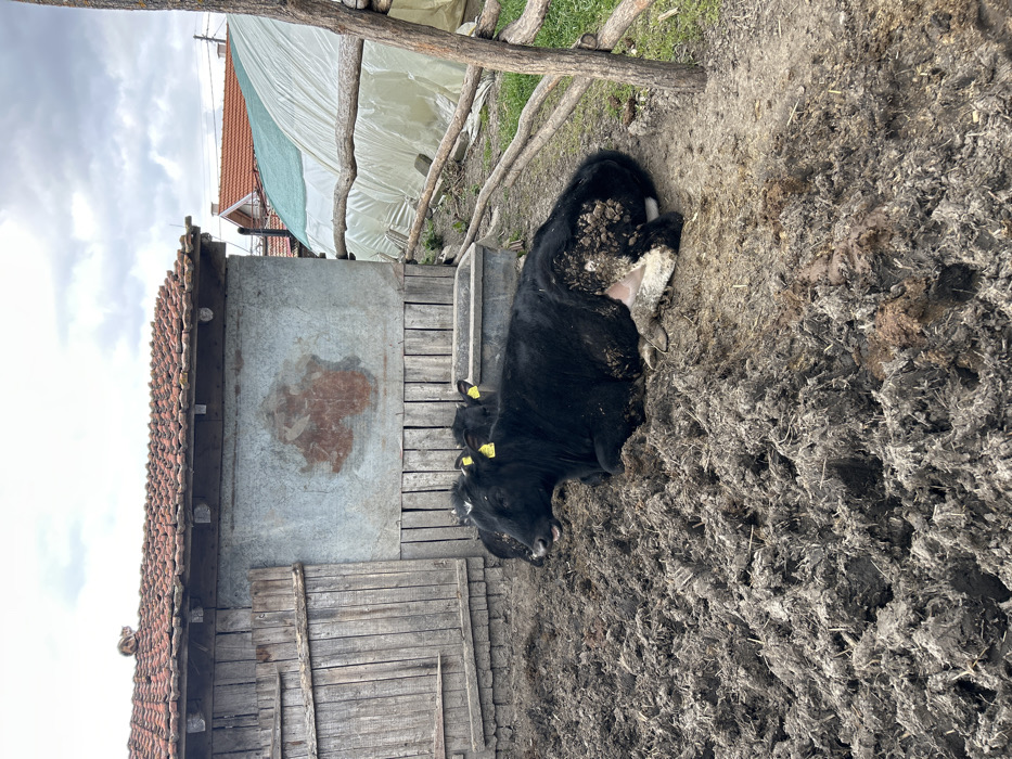 The scene depicts a rural enclosure in Sredkovets, Bulgaria, under an overcast sky. In the foreground, a large, black bovine lies on its right side in a heavily churned, muddy area composed of dark earth, straw, and animal waste. The bovine exhibits yellow ear tags in both ears and has a significant accumulation of dried mud or manure on its hindquarters, contrasted with visible white fur on its belly/udder. Its head is slightly raised, mouth partially open. Behind this animal, parts of at least two other black bovines with yellow ear tags are visible near a rectangular, gray water trough. To the left, an old, single-story structure stands, featuring a lower section of weathered vertical wooden planks and an upper section of corrugated metal with a prominent reddish-brown stain. The building is topped with a terracotta-tiled roof, upon which a light brown tabby cat rests near the peak. To the right of the enclosure, a rustic fence constructed from irregular wooden branches separates the muddy area from a patch of green grass. In the background, behind the fence, a large, arched structure covered in translucent light green sheeting, consistent with a greenhouse or polytunnel, is present. Beyond these immediate structures, residential rooftops with red tiles are partially visible under the cloudy sky.