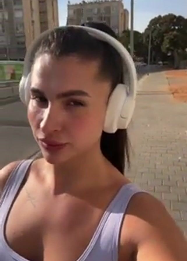 A woman wearing a lavender athletic bodysuit and white headphones is walking down a sidewalk made of light gray bricks on a sunny day. She is facing the camera, then rotates to the side as she walks. Her dark hair is pulled back into a high ponytail. Behind her are buildings and trees. There is also a gray street with a green railing.