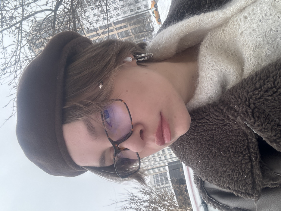 A person wearing glasses and a brown beret looks to the side. They're clad in a brown sherpa jacket and a white, fuzzy scarf. The background is blurry with leafless trees and buildings covered in snow. The sky is overcast. The individual has fair skin and short brown hair. They are wearing silver earrings.