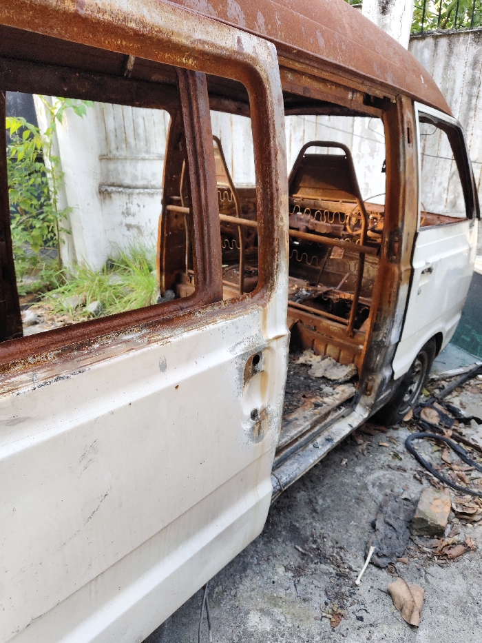 - "An abandoned, severely fire-damaged light-colored van is depicted outdoors in Blue Area, Pakistan" by FM-uPtwu2, licensed under CC BY 4.0