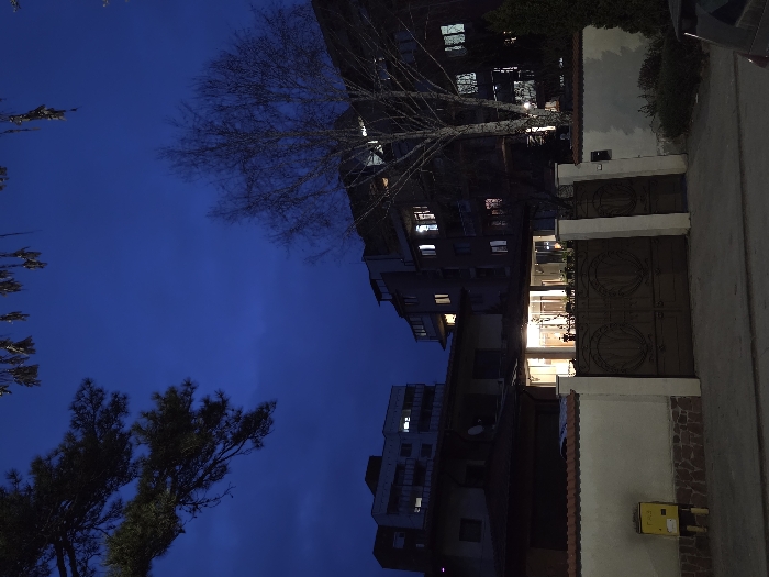 The image depicts a nighttime urban scene in Pleven, Bulgaria, during the blue hour. A paved surface occupies the foreground. In the midground, a light-colored, low-rise wall with a stone base runs horizontally, featuring a dark, ornate double gate with circular emblems in the center. To the left of the gate, a yellow utility box is mounted on a matching stone base. Behind the wall and gate, a single-story building is visible, with its interior brightly illuminated, particularly a glass-enclosed section. Above this building, parts of a multi-story apartment complex are visible, with several windows exhibiting interior illumination. In the background, another taller apartment building with lit windows stands. Overhead, the sky is a deep indigo. Bare deciduous trees with visible branches and a portion of a conifer tree with needles are present on the left and right sides of the frame. A dark-colored vehicle is partially visible on the far right of the foreground. No individuals are present in the scene.