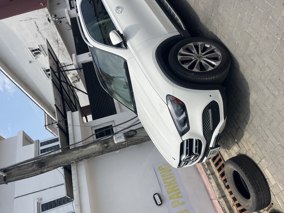 A white Mercedes-Benz SUV is parked on a grey paver-stone surface in Ojomu, Nigeria, oriented towards the front-left of the frame