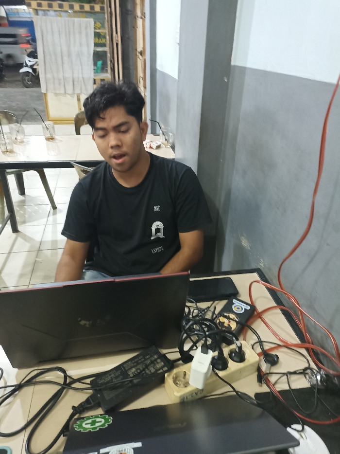 An Asian man in a black t-shirt sits at a table. He's in front of a black laptop with an extension cord and various chargers on the table. Another laptop is visible beneath the first. The man appears to be yawning or speaking with his mouth open. The background shows a simple interior with gray walls, a window with white curtains, and glimpses of the outside. A motorbike is partially visible through the window.
