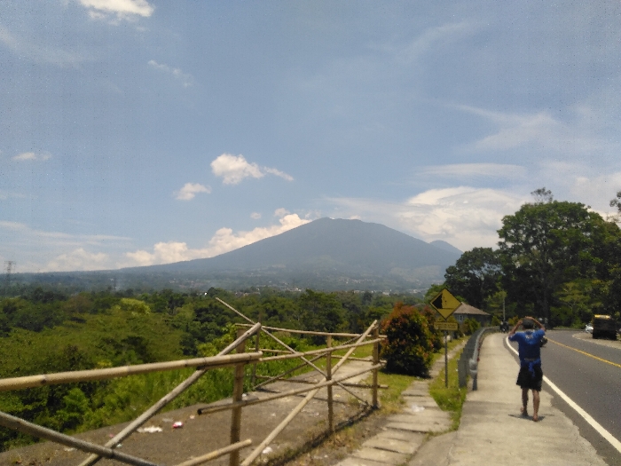 The image displays a mountainous landscape scene in the city of Pyi Nuang, Myanmar, under a bright blue sky with scattered white clouds. In the foreground, on the left, a rudimentary fence constructed from light-colored bamboo poles parallels a concrete path. Below the fence and extending into the midground is a dense expanse of green trees and vegetation. On the right, a paved asphalt road features a solid white edge line. A concrete sidewalk runs alongside the road. One individual is visible walking away from the camera on this sidewalk, wearing a blue short-sleeved shirt and dark shorts, with both hands raised to the back of their head. Adjacent to the sidewalk, a yellow diamond-shaped road sign with a black downward-sloping symbol is present. A dark-colored vehicle is partially visible on the far right lane of the road, moving away from the viewer. In the midground, beyond the tree line, distant residential structures are visible. The background is dominated by a large, prominent mountain with a visible peak, appearing hazy blue-grey, with smaller peaks to its right. A power transmission tower is faintly discernible in the far left background above the tree line.