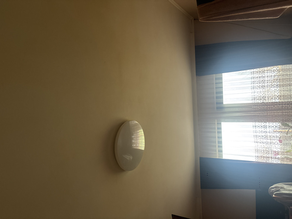 The image captures an interior scene within a room located in Kalipetrovo, Bulgaria, viewed from a low angle directed upwards. The ceiling is a uniform light beige, featuring a white, oval-shaped flush-mount light fixture positioned centrally in the upper half of the frame; the fixture is currently unlit but reflects bright ambient light. Below the ceiling, a large window dominates the lower portion of the image, allowing abundant natural light to enter. This window is covered by sheer, light-colored curtains with a lace pattern, and is flanked by dark blue or grey solid drapes pulled back to the sides. Objects are faintly discernible on the windowsill through the sheer curtains. The wall on the left side of the frame displays a horizontal section of a darker color, possibly blue or grey, below the lighter upper wall. In the lower left quadrant, a light grey garment, consistent with a hooded sweatshirt, is draped over an unidentified object. On the far right edge, a beige towel or blanket hangs from an unseen fixture. No individuals or specific activities are present.