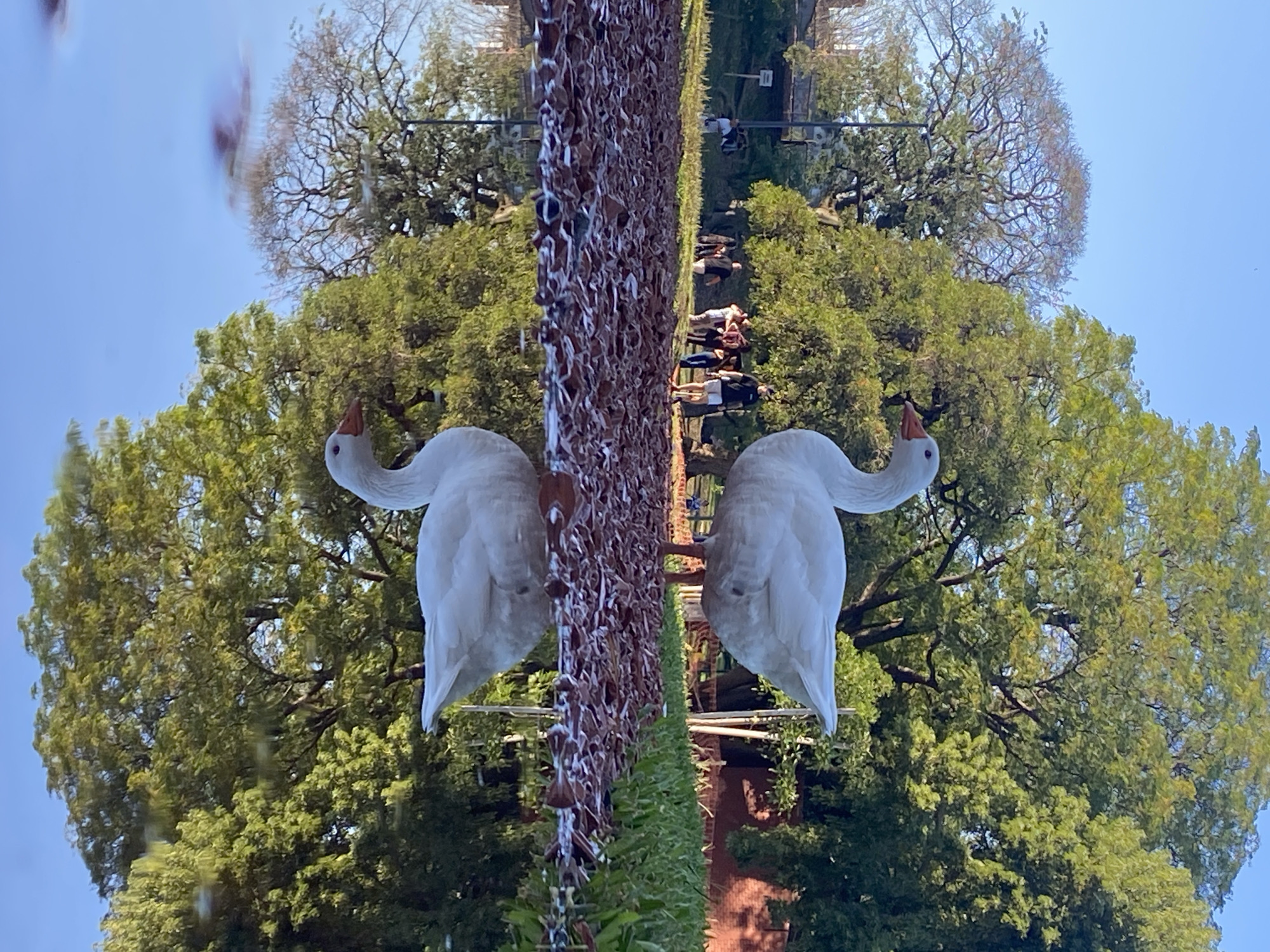 reflection of a scene in Buenos Aires, Argentina, featuring two white geese in the foreground, likely statues. In the background, there is a walkway lined with greenery and people strolling along it. Above, there are large trees with visible branches and foliage, set against a blue sky.