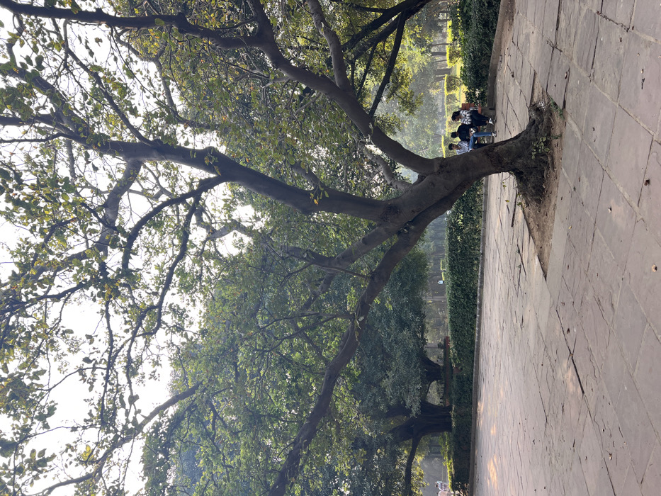 The image displays an outdoor park scene, identified as Lodi Garden in Delhi, India