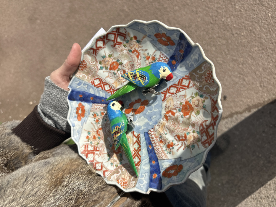 In Neuilly-Plaisance, France, an individual is observed outdoors, holding a decorative, multi-colored ceramic plate. The plate, exhibiting a scalloped edge and intricate patterns of florals, geometric shapes, and waves in blue, orange, red, green, and brown, is supported by the person's right hand. The individual wears a brown fur or faux-fur jacket over a gray ribbed-cuff garment, with blue denim visible below. Two small, brightly colored parrot figures rest on the plate, each affixed with a silver-colored metal clip. These figures are predominantly blue and green with yellow/white faces and red beaks; one parrot is oriented left, the other angled sharply downwards right. The scene is illuminated by strong sunlight, casting distinct shadows onto a light brown/grey ground surface, consistent with concrete or asphalt.