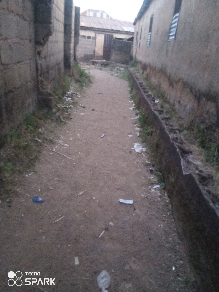 The image depicts a narrow, unpaved earthen pathway in Jos, Nigeria, flanked by residential structures under an overcast sky