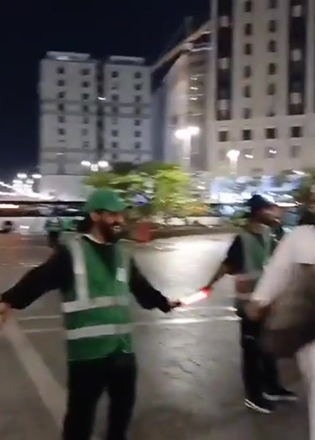 A group of people, some wearing green vests and holding red lights, are forming a human barrier on a street. They are holding hands to create a line. The people are standing in the middle of a street with cars and buildings in the background. Some of the people passing by are wearing traditional clothing. It is nighttime, and the scene is illuminated by streetlights.