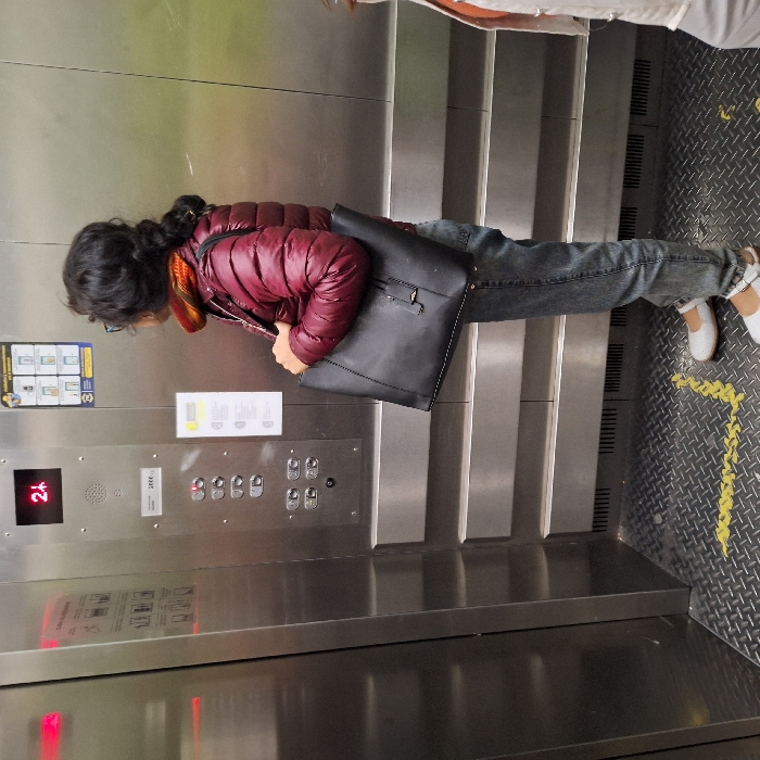Inside an elevator, a woman presses the button panel, which displays the number 2. She wears glasses, a red puffer jacket, and jeans. She carries a large black tote bag on her shoulder. The elevator walls and floor are stainless steel, with a textured pattern on the floor. Next to the elevator is a staircase. Another person is standing on the stairs.