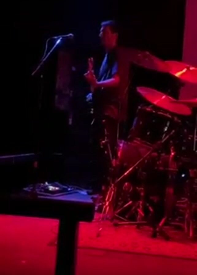 A man is playing an electric guitar on stage. He's wearing a black shirt and black pants. A microphone stands in front of him. To the right is a drum set. The stage is lit with red and blue lighting. The stage is covered with a red patterned rug.
