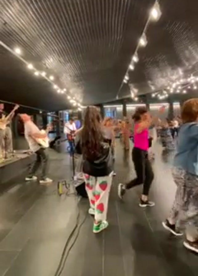 A band performs for a crowd of people. The band consists of a drummer, a bassist, and at least two guitarists. The audience members are facing the band and dancing to the music. The room has a black tiled floor and an undulating dark ceiling with string lights hanging from it.